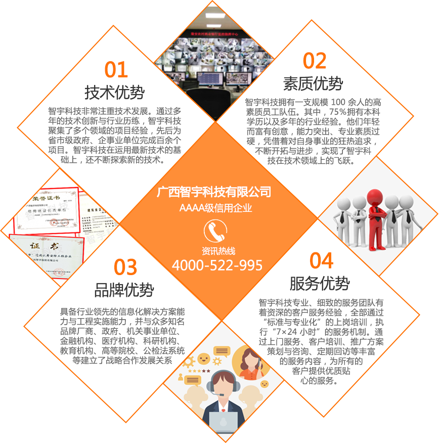 廣西智宇科技有限公司,自1995年成立以來,已發(fā)展成為一家高新技術(shù)企業(yè),擁有多家分公司,遍布南寧、桂林、玉林、河池、扶綏、百色、欽州、防城港等地。憑借30年的專業(yè)經(jīng)驗(yàn)和技術(shù)儲(chǔ)備,智宇科技已成為一家行業(yè)領(lǐng)先的集團(tuán)企業(yè),致力于運(yùn)用前沿科技產(chǎn)品和技術(shù),為客戶提供高效服務(wù)。